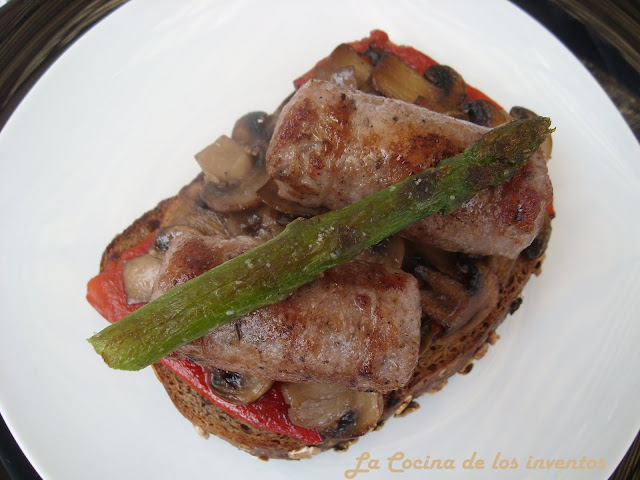 Primera capa la "torrada", segunda capa pimientos del piquillo, tercera capa los champiñones, cuarta capa la longaniza y coronando el espárrago verde.